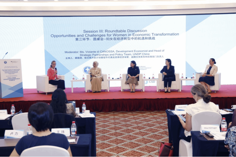 专题讨论环节,女性创业融资倡议秘书处主任温迪、国合署全球发展促进中心主任汤瑛、中华女子学院副院长李莹、德国国际合作机构中德可持续发展中心主任霍曼、非洲政策研究所创始人奥卢米德从政策研究和国际发展合作实践的角度探讨了性别平等推动可持续发展的路径。